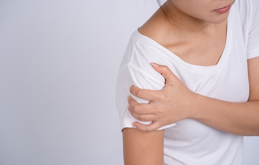 오십견 증상 4. 아픈 팔로 반대쪽 어깨를 만지려고 하면 통증이 느껴지고 움직임이 제한됩니다.