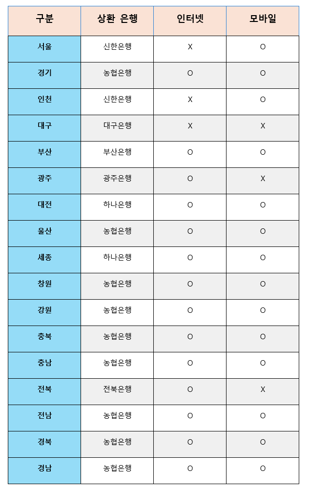 각 지역별로 환급금 상환을 담당하는 은행은 다르게 설정되어 있습니다.